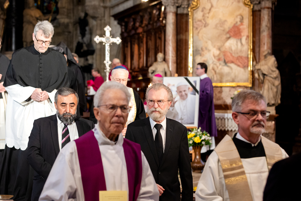 Mit einem "Requiem für seine Heiligkeit Papst Franziskus" nahm Österreich am Montagabend offiziell Abschied vom Papst. Dem Gottesdienst stand der Vorsitzende der Österreichischen Bischofskonferenz, Erzbischof Franz Lackner vor. Mit ihm konzelebrierten die heimischen Bischöfe. Die Politik war an erster Stelle von Bundespräsident Alexander Van der Bellen und Bundeskanzler Christian Stocker vertreten. Zahlreiche Gläubige gaben dem Papst im vollen Dom ebenfalls die letzte Ehre